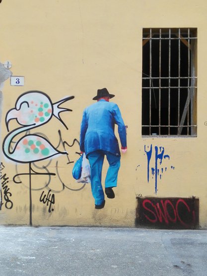Myös talojen kyljissä oli paljon tägejä tai graffiteja. Kuvailin jonkun verran niitä ja yksi niistä oli korea kuninkaallinen lintu sekä mies, joka käveli katsojasta pois päin. Hetken päästä käveltyäni, huomasin, että 2 ihmistä olivat kuin suoraan tuosta tägi/graffiti-vastaavasta. En tiedä, miksi olin ja olen edelleen niin kovin fiiliksistä näistä kuvaparista. Periaatteessa toinen kuvista on epäonnistunut totaalisesti, kun siinä on paljon liike-epäterävyyttä, mutta olen päättänyt, että mä voin olla eri mieltä kuvan onnistumisesta.