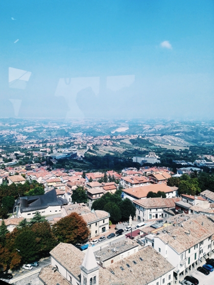 San Marinosta ei tuntunut löytyvän ennen matkaa mitään kovin perehtynyttä vinkkilistaa, joten päädyttiin tekemään hyvin, hyvin perinteisen turistin kierros. Ajeltiin jollain näköalabussivaunulaitteella, mikä periaatteessa laskeutui taas siihen kategoriaan, mistä minä pidän, eli maisemien katselua bussista (tai junasta), mutta ihan samanlaiseen tunnelmaan tässä ei päässyt. Vaijerihissimatka oli lyhyt ja hieman pettymys, vaikkakin olihan sieltä kauniit maisemat. Jos haluaa hieman kuumottavan vaijerihissikokemuksen, suosittelen Madeiraa ja Funchalin vanhasta kaupungista Monteen ja sieltä Madeiran kasvitieteelliseen puutarhaan. Se kulkee pitkiä matkoja reilusti puiden yläpuolella ja autot näyttivät leikkiautoilta. Mutta San Marinossa ylöspäin kaapelihissi oli vaihtoehdoista kivin. Muut vaihtoehdot olivat joko hissi tai iso määrä portaita.